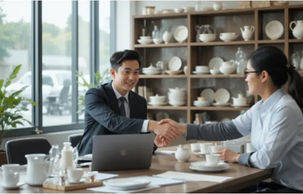 Customer and Chinese supplier discussing crockery samples during a professional office meeting