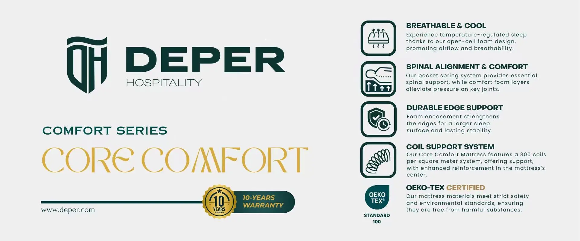 At Deper Hospitality, we understand the deep connection between sleep quality and customer loyalty. That’s why we’ve developed the Comfort Series, featuring Core Comfort and Luxe Comfort mattresses, premium solutions engineered for performance, durability, and an unmatched sleep experience.